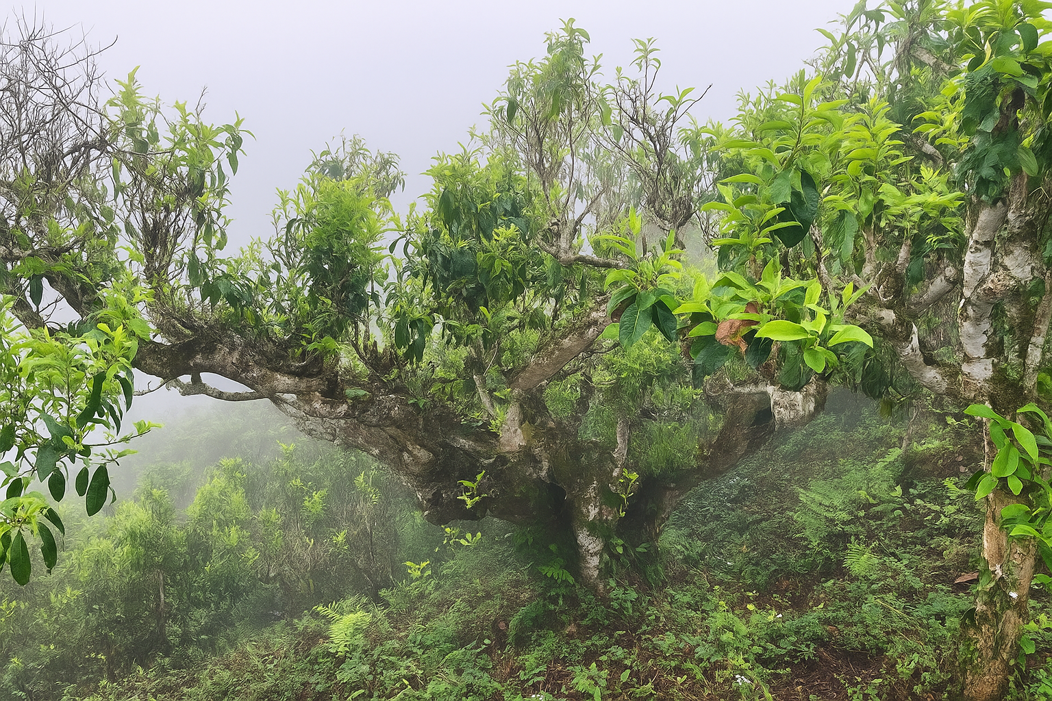 Những cây Shan Tuyết hàng trăm năm tuổi mọc giữa mây núi, được chăm sóc hoàn toàn tự nhiên.